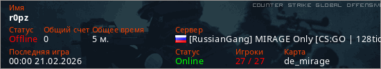 Играет на Counter Strike Global Offensive сервере. Страна: РоссияПервый раз замечен 23:20 20.02.2026