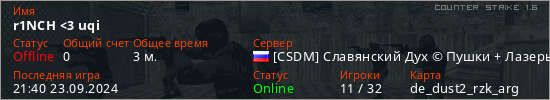 Играет на Counter Strike 1.6 сервере. Страна: РоссияПервый раз замечен 21:40 23.09.2024