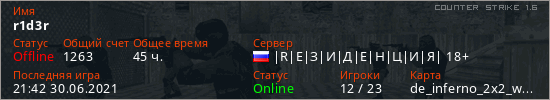Играет на Counter Strike 1.6 сервере. Страна: РоссияПервый раз замечен 16:54 14.12.2020