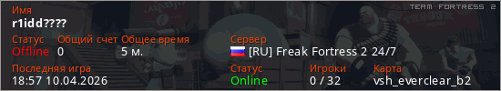 Играет на Team Fortress 2 сервере. Страна: РоссияПервый раз замечен 18:29 10.04.2026