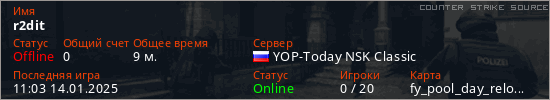 Играет на Counter Strike Source сервере. Страна: РоссияПервый раз замечен 11:46 09.01.2025