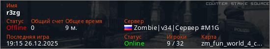 Играет на Counter Strike Source сервере. Страна: РоссияПервый раз замечен 17:45 26.12.2025