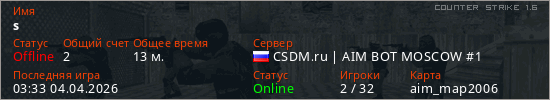 Играет на Counter Strike 1.6 сервере. Страна: РоссияПервый раз замечен 01:48 04.04.2026