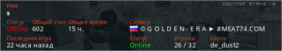 Играет на Counter Strike 1.6 сервере. Страна: РоссияПервый раз замечен 01:06 22.01.2023