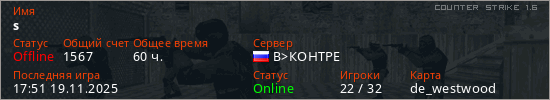 Играет на Counter Strike 1.6 сервере. Страна: РоссияПервый раз замечен 06:49 13.11.2019