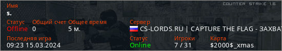 Играет на Counter Strike 1.6 сервере. Страна: РоссияПервый раз замечен 09:21 15.03.2024