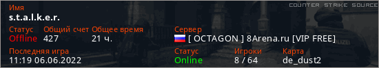 Играет на Counter Strike Source сервере. Страна: РоссияПервый раз замечен 22:43 21.02.2020