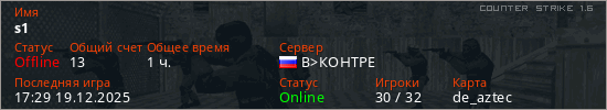 Играет на Counter Strike 1.6 сервере. Страна: РоссияПервый раз замечен 16:51 06.08.2022