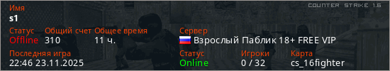 Играет на Counter Strike 1.6 сервере. Страна: РоссияПервый раз замечен 00:18 03.01.2020