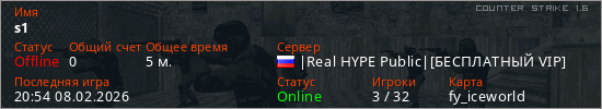 Играет на Counter Strike 1.6 сервере. Страна: РоссияПервый раз замечен 20:44 08.02.2026