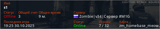 Играет на Counter Strike Source сервере. Страна: РоссияПервый раз замечен 16:03 27.10.2025