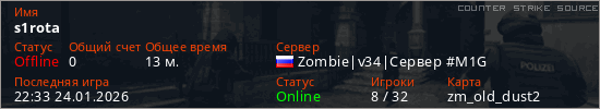 Играет на Counter Strike Source сервере. Страна: РоссияПервый раз замечен 12:23 24.01.2026