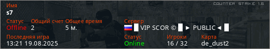 Играет на Counter Strike 1.6 сервере. Страна: РоссияПервый раз замечен 13:15 19.08.2025