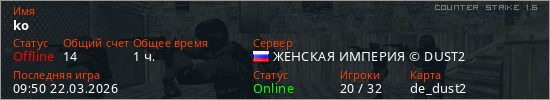 Играет на Counter Strike 1.6 сервере. Страна: РоссияПервый раз замечен 09:53 16.03.2026