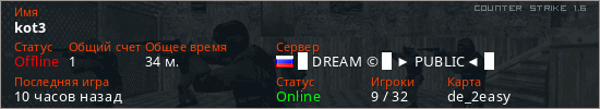 Играет на Counter Strike 1.6 сервере. Страна: РоссияПервый раз замечен 15:43 17.03.2026
