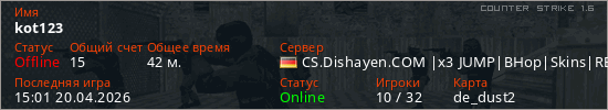 Последний раз был в сети 15:01 20.04.2026 Игрок с таким ником замечен на 2 серверах