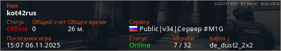 Играет на Counter Strike Source сервере. Страна: РоссияПервый раз замечен 07:57 02.11.2025