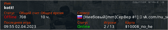 Последний раз был в сети 09:55 02.04.2023 Игрок с таким ником замечен на 12 серверах