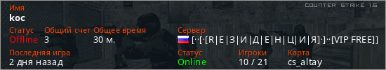 Играет на Counter Strike 1.6 сервере. Страна: РоссияПервый раз замечен 13:18 08.03.2026