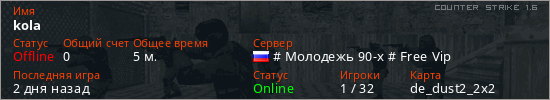 Играет на Counter Strike 1.6 сервере. Страна: РоссияПервый раз замечен 11:50 04.12.2025