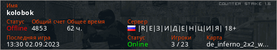 Последний раз был в сети 13:30 02.09.2023 Игрок с таким ником замечен на 24 серверах