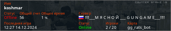 Играет на Counter Strike 1.6 сервере. Страна: РоссияПервый раз замечен 13:43 19.04.2024