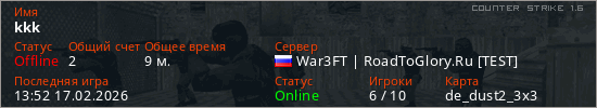 Играет на Counter Strike 1.6 сервере. Страна: РоссияПервый раз замечен 20:26 12.02.2026