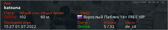 Играет на Counter Strike 1.6 сервере. Страна: РоссияПервый раз замечен 23:56 29.06.2022