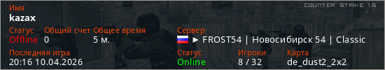 Играет на Counter Strike 1.6 сервере. Страна: РоссияПервый раз замечен 20:04 10.04.2026