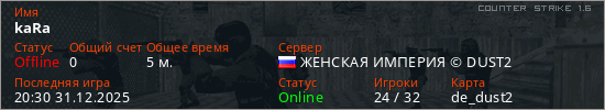Играет на Counter Strike 1.6 сервере. Страна: РоссияПервый раз замечен 20:28 31.12.2025