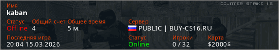Играет на Counter Strike 1.6 сервере. Страна: РоссияПервый раз замечен 20:01 15.03.2026