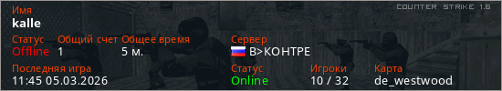 Играет на Counter Strike 1.6 сервере. Страна: РоссияПервый раз замечен 11:43 05.03.2026