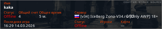 Играет на Counter Strike Source сервере. Страна: РоссияПервый раз замечен 16:06 14.03.2026