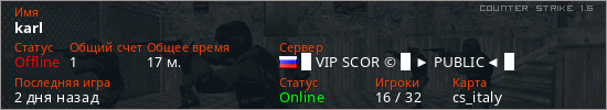 Играет на Counter Strike 1.6 сервере. Страна: РоссияПервый раз замечен 20:11 13.12.2025