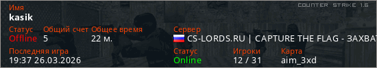 Играет на Counter Strike 1.6 сервере. Страна: РоссияПервый раз замечен 09:59 17.03.2026