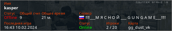Играет на Counter Strike 1.6 сервере. Страна: РоссияПервый раз замечен 00:04 07.01.2024