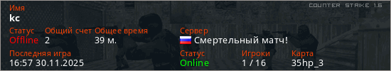 Играет на Counter Strike 1.6 сервере. Страна: РоссияПервый раз замечен 22:15 27.11.2025