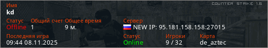 Играет на Counter Strike 1.6 сервере. Страна: РоссияПервый раз замечен 10:21 24.10.2025
