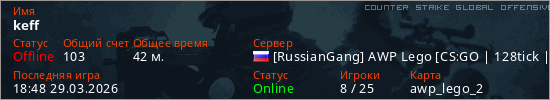 Играет на Counter Strike Global Offensive сервере. Страна: РоссияПервый раз замечен 14:54 14.03.2026