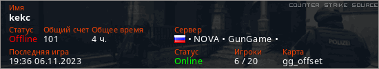 Играет на Counter Strike Source сервере. Страна: РоссияПервый раз замечен 21:16 11.06.2023