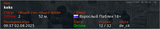 Играет на Counter Strike 1.6 сервере. Страна: РоссияПервый раз замечен 22:13 04.02.2022