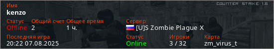 Играет на Counter Strike 1.6 сервере. Страна: РоссияПервый раз замечен 16:58 20.06.2021