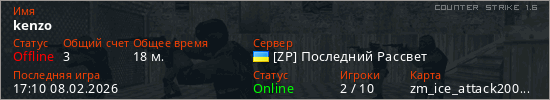 Играет на Counter Strike 1.6 сервере. Страна: УкраинаПервый раз замечен 21:29 05.02.2026