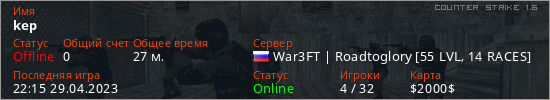 Играет на Counter Strike 1.6 сервере. Страна: РоссияПервый раз замечен 21:42 29.04.2023