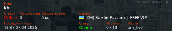 Играет на Counter Strike 1.6 сервере. Страна: УкраинаПервый раз замечен 13:34 07.04.2026