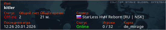 Играет на Counter Strike Global Offensive сервере. Страна: РоссияПервый раз замечен 23:52 31.12.2025