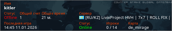 Играет на Counter Strike Global Offensive сервере. Страна: КазахстанПервый раз замечен 19:19 09.01.2026