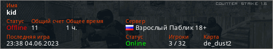 Играет на Counter Strike 1.6 сервере. Страна: РоссияПервый раз замечен 10:55 04.05.2020