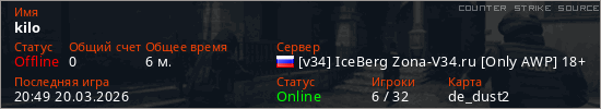 Играет на Counter Strike Source сервере. Страна: РоссияПервый раз замечен 20:41 20.03.2026