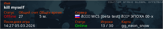 Играет на Counter Strike Global Offensive сервере. Страна: РоссияПервый раз замечен 14:06 05.03.2026